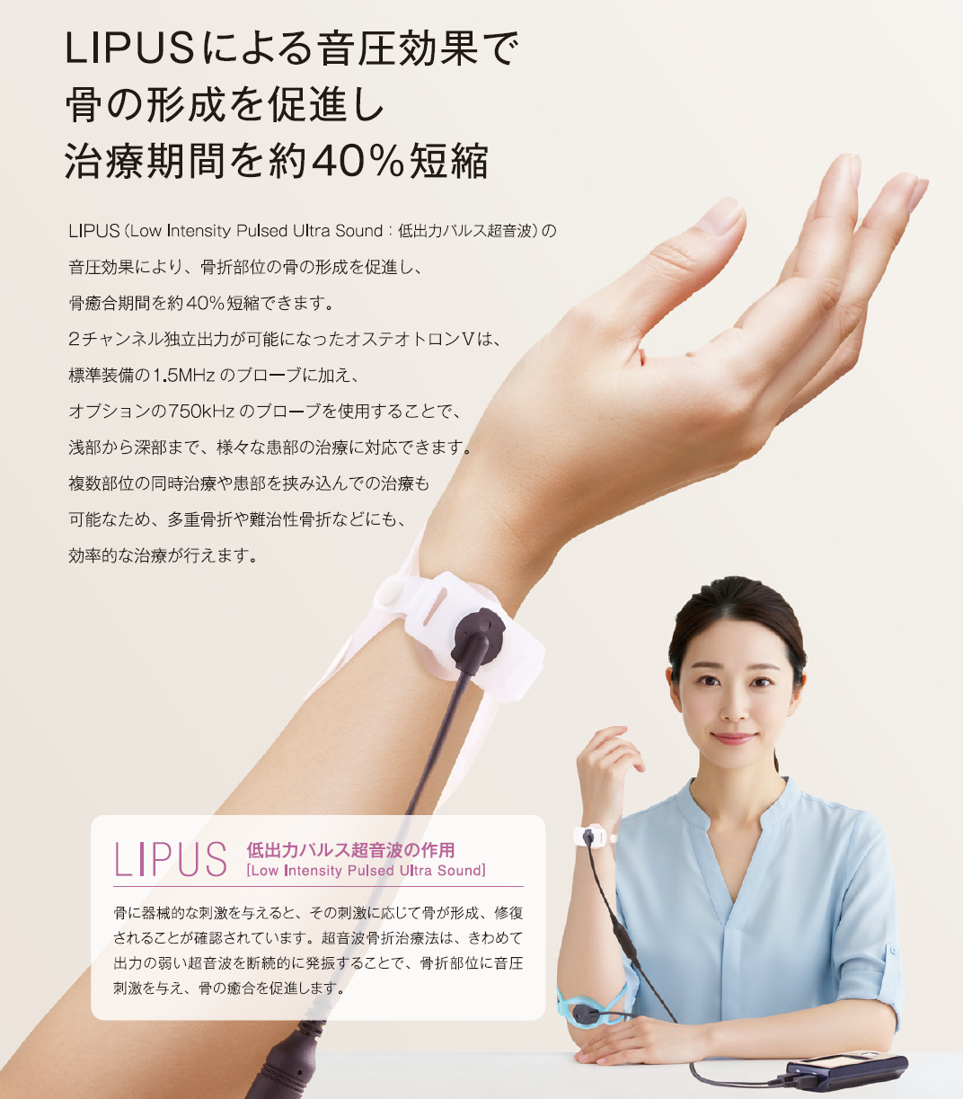 LIPUS(低出力超音波パルス)は、骨折した部位にやさしい超音波をあてることで、骨の回復を早める治療法です。特殊な超音波が骨の修復を助け、カルシウムの集まりを促すことで、骨の強度を高め、骨癒合を促進します。