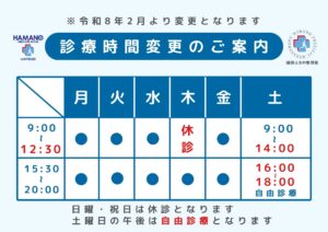 誠に勝手ながら、はまの整骨院、国領はまの整骨院ともに2026年2月より診療時間を下記の通り変更させていただきます。