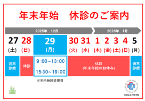 | ・年末年始休診 12月30日(火)~1月4日(日) 1月5日(月)より診療再開いたします。 |